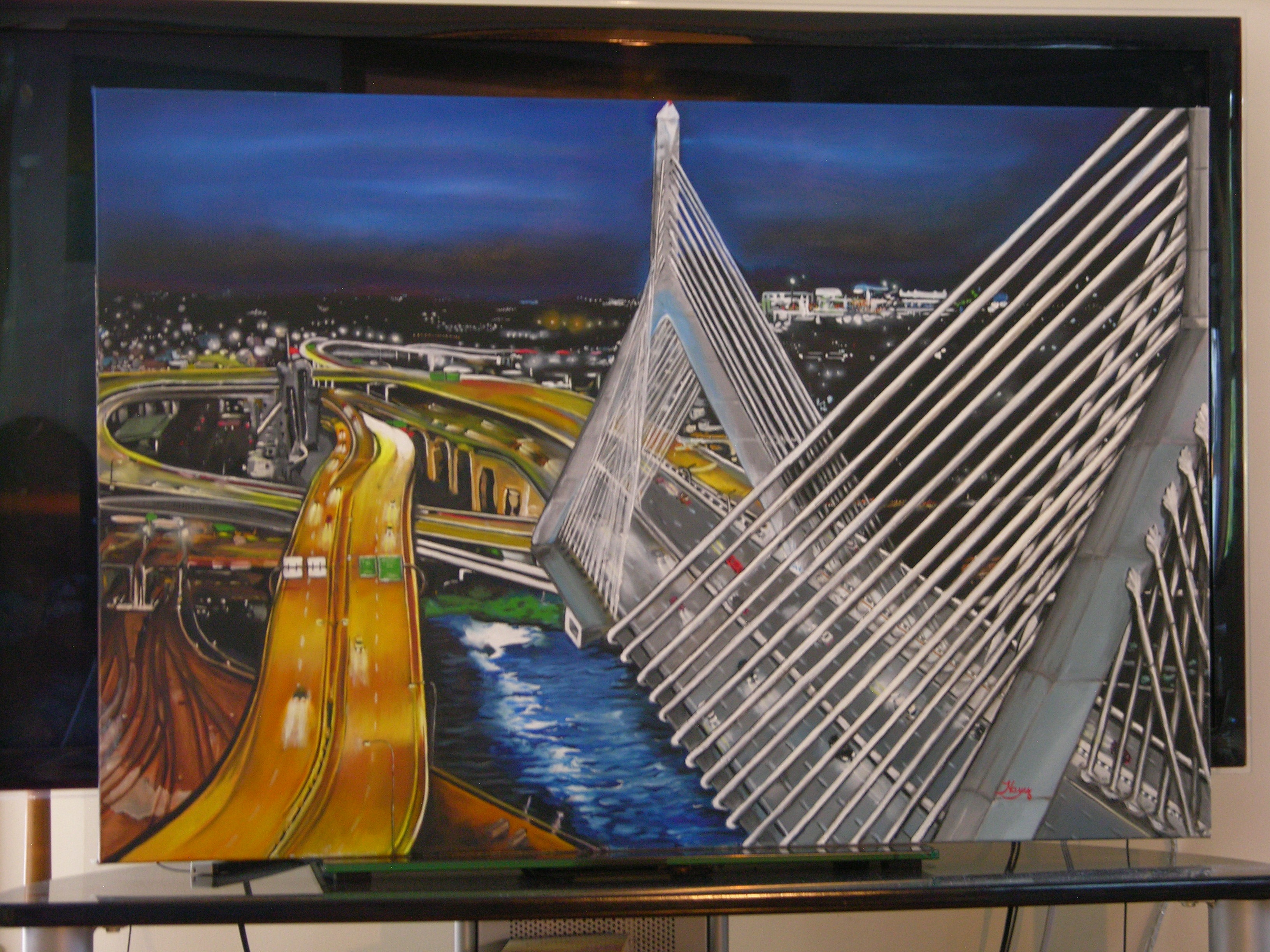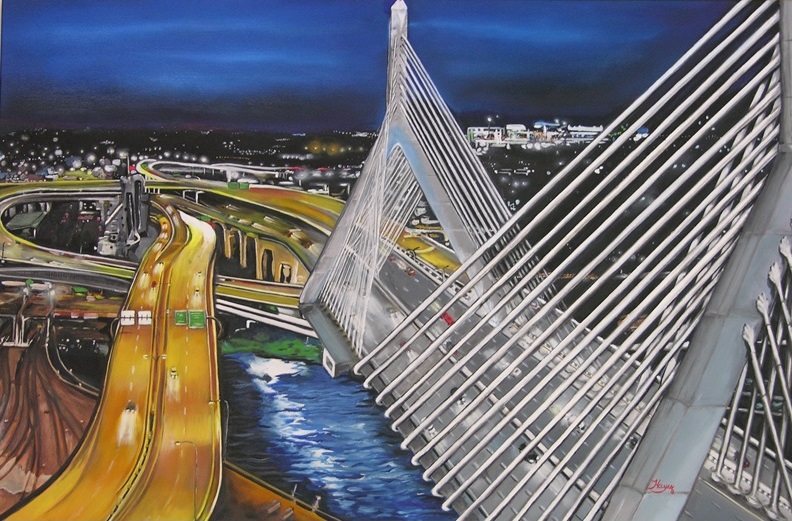 The painting of the Leonard P. Zakim Cable Bridge which is located in Boston, Massachusetts, was created using Oil as a medium on a 30×40 gallery wrapped box canvas. The Oil painting depicts the evening crossing of the Charles River. The Painting is set against a skyline of various blues and black. As the lights of casinos set in the distance dots across the horizon. One of Boston’s rail stations and the Boston Sandpit sits off in the distance. The colors selected to create this work of art, were Ultramarine blue, Prussian Blue, Phatho Blue, Titanium White, Soft White, Indian Yellow, Van dike Brown, Burnt Umber, Raw Umber, Light Red, Cadmium Red light, Lemon Yellow, Yellow Ochre, Raw Sienna, Mars Black, and Cadmium Orange.
